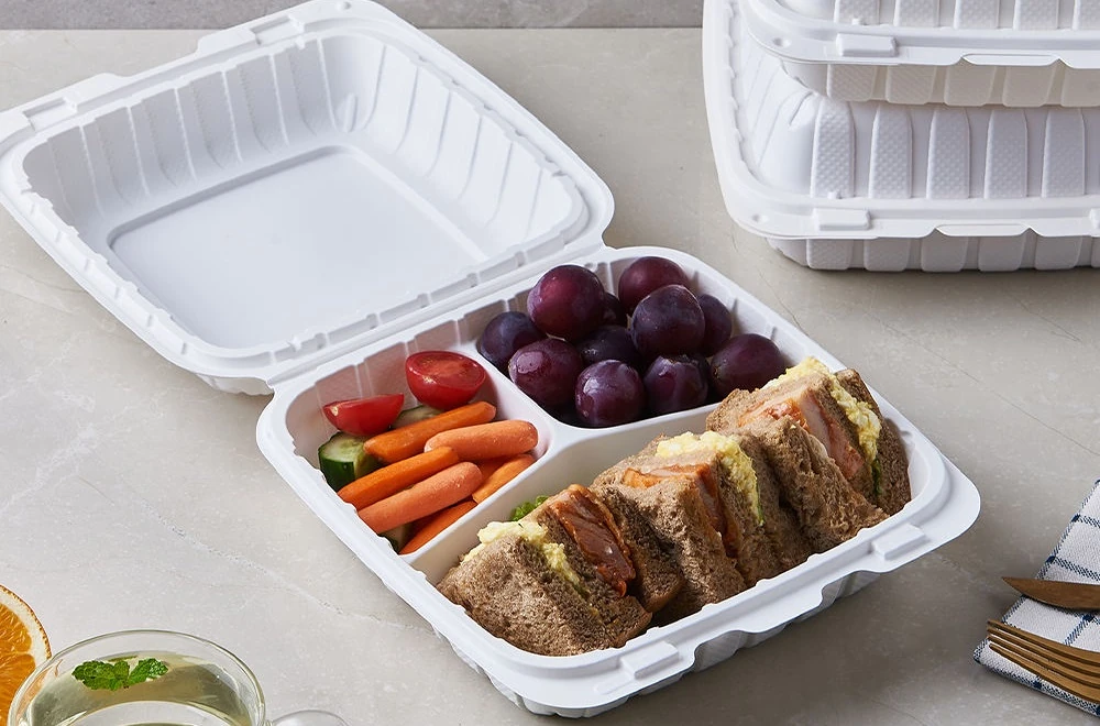 HSQY Plastic Group's 8x8x3 inch (203.2x203.2x76.2mm) PP hinged lid takeout containers, made from polypropylene, feature a 3-compartment design. Ideal for B2B clients in food service, catering, and takeout, these BPA-free, microwave-safe containers are stackable, leak-resistant, and recyclable, ensuring fresh and portable meals.