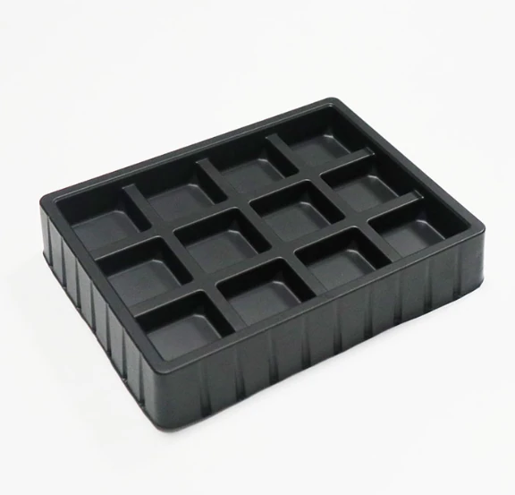 HSQY Plastic Group's PET blister insert trays, measuring 127x127x21mm (5x5x0.8 inches), are made from recyclable polyethylene terephthalate (PET). These durable, BPA-free trays enhance product display while protecting food items, ideal for B2B clients in food packaging and retail industries, with customizable colors and styles.