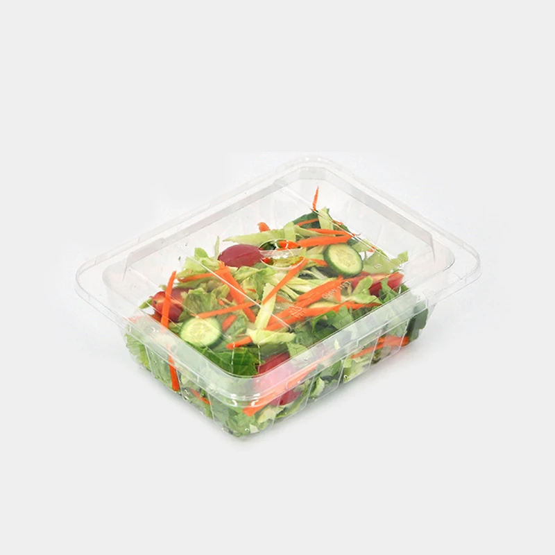 HSQY Plastic Groupi läbipaistvad PET-salatikausid, mis on valmistatud taaskasutatavast polüetüleentereftalaadist (PET), on mõeldud salatite ja muude külmade toitude jaoks. Saadaval suurustes 176x176x42mm ja 176x176x60mm hingedega kaanega. Need vastupidavad ja läbipaistvad kausid sobivad ideaalselt B2B-klientidele toitlustus- ja jaekaubanduses, tagades nähtavuse ja värskuse.